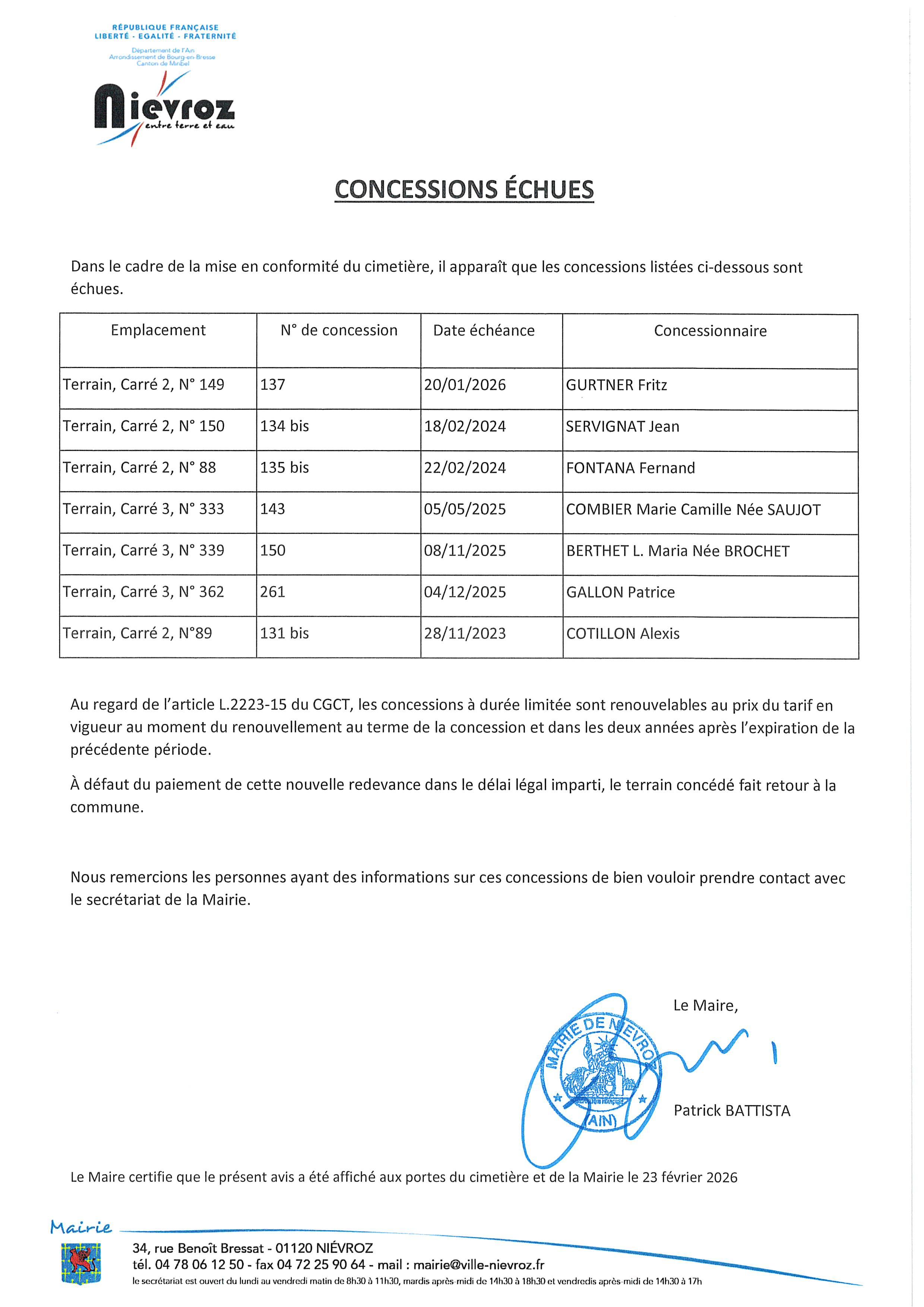 Détail d'actualité Concessions échues - février 2026 « Concessions échues - février 2026 » Toutes les actualités