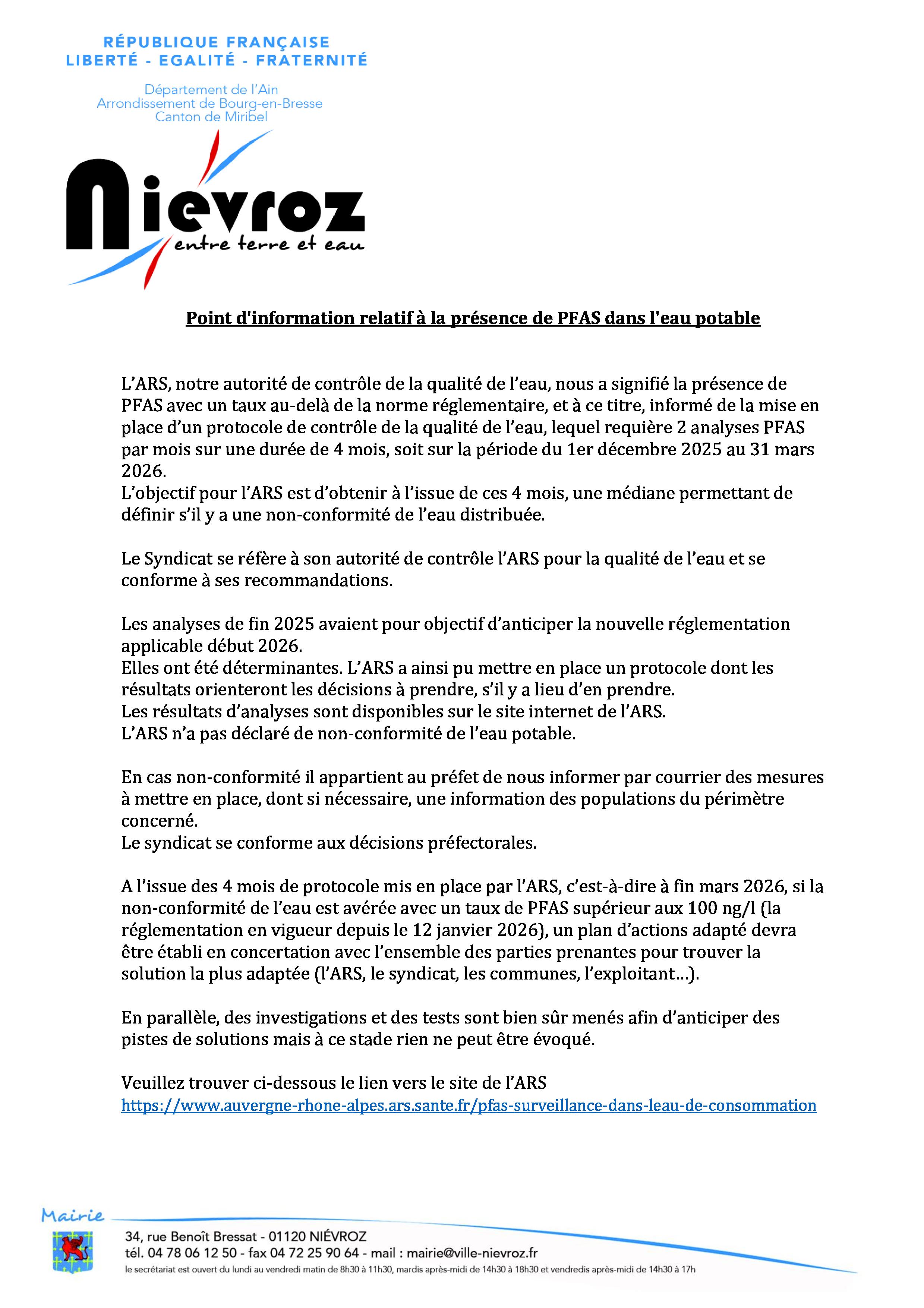 Détail d'actualité Point d'information relatif à la présence de PFAS dans l'eau potable Point d'information PFAS.pdf Toutes les actualités